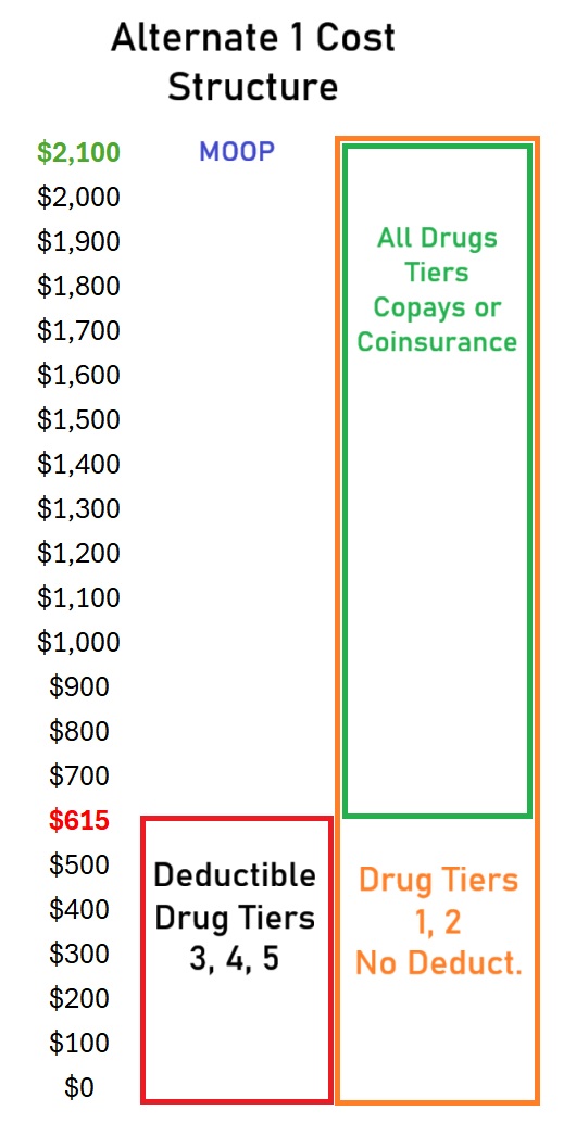Medicare allows alternate cost structure designs. These designs must be as good as the standard cost structure. One alternate structure only has drugs in tiers 3, 4, 5 subject to the pharmacy deductible. Generic drugs, tiers 1 and 2, are not subject to any deductible. The plan member goes straight into a set copayment or coinsurance for the prescriptions.