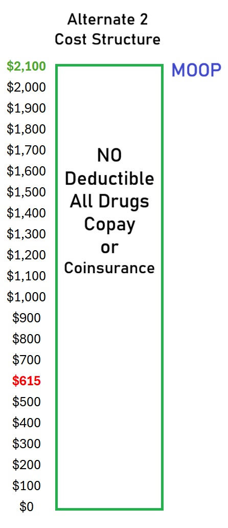 Once you have met the $2,100 maximum out-of-pocket amount of the drug plan, the plan covers all prescription drug costs for the remainder of the calendar year.
