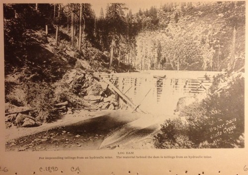 Two of the photos are debris dams built after the 1884 Sawyer Decision to comply with the retention of hydraulic mining debris. The hydraulic elevator picture show one of the mining areas in or around Malakoff State Historic- See: Malakof Diggins Hydraulic Mines and Hike. Because I didn’t know what a “hydraulic elevator was, I’ve included a diagram I found in an old mining book. Click on the thumbnail to enlarge.