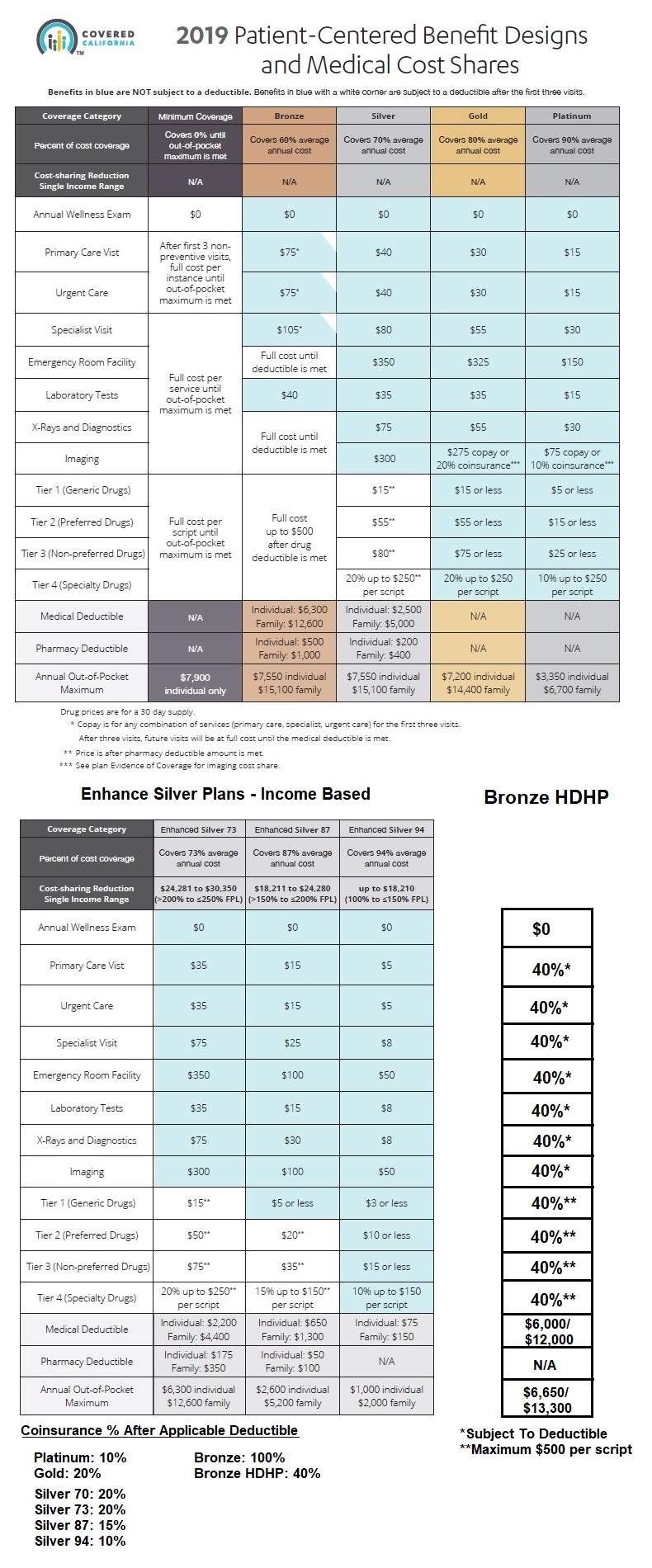 The 2018 standard Covered California Bronze plan has a $6,300 medical deductible, $500 pharmacy deductible and a $7,000 maximum out-of-pocket (MOOP) amount. Excluding preventive services, the member pays 100% of the negotiated health care service rates except for the 3 office visits and $40 lab tests.