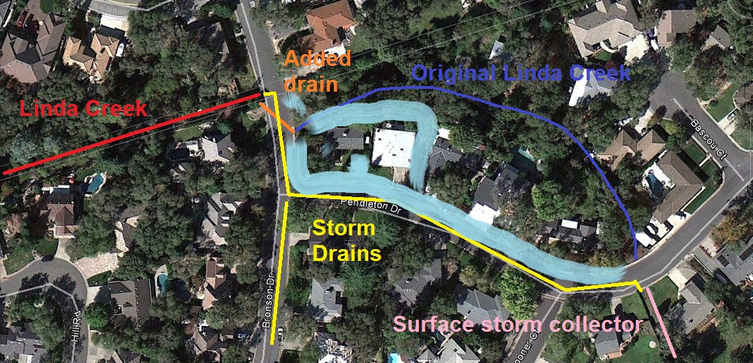After the 2005 event some of the neighbors were successful in getting Placer County to come out and look at the storm water drainage situation. All that the county crews did was clean the creek. We knew that was not the problem. This year’s flood event proved that the beginning of Linda Creek is not the cause of the flooding. The problem is three different subdivisions, built at different times, all trying to force their storm water into one collection point at the head of Linda Creek.