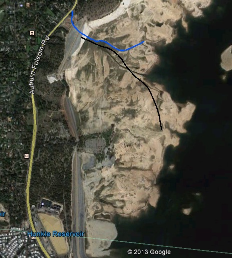 Folsom Lake from October 23, 2009, all of the map features of the North Fork Ditch and roads pretty much line up with the historic remnants in the photo. When either the North Fork or Rose Spring Ditch could not be excavated in the native terrain to maintain the gradient, they would build an earth berm on one side. If this earth berm is washed away, there is little trace of the ditch save for some possible concrete or unnaturally smooth flat ground. I have not been able to locate any concrete lining along the route of the North Fork Ditch spur. I am not sure if it was never lined, was washed away by rising lake levels or destroy by earth movers to build Folsom dam. Consequently, I have used the clues of nice flat lines coupled with historic topographic maps to approximate its path.