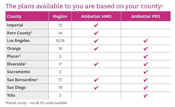 The counties of Imperial and Kern will only be offered HMO plans and Kern will have zip code limits. The counties of Los Angeles, Orange, Riverside, San Bernardino, and San Diego will be offered both PPO and HMO plans. There are zip code limits in Riverside and San Bernardino.