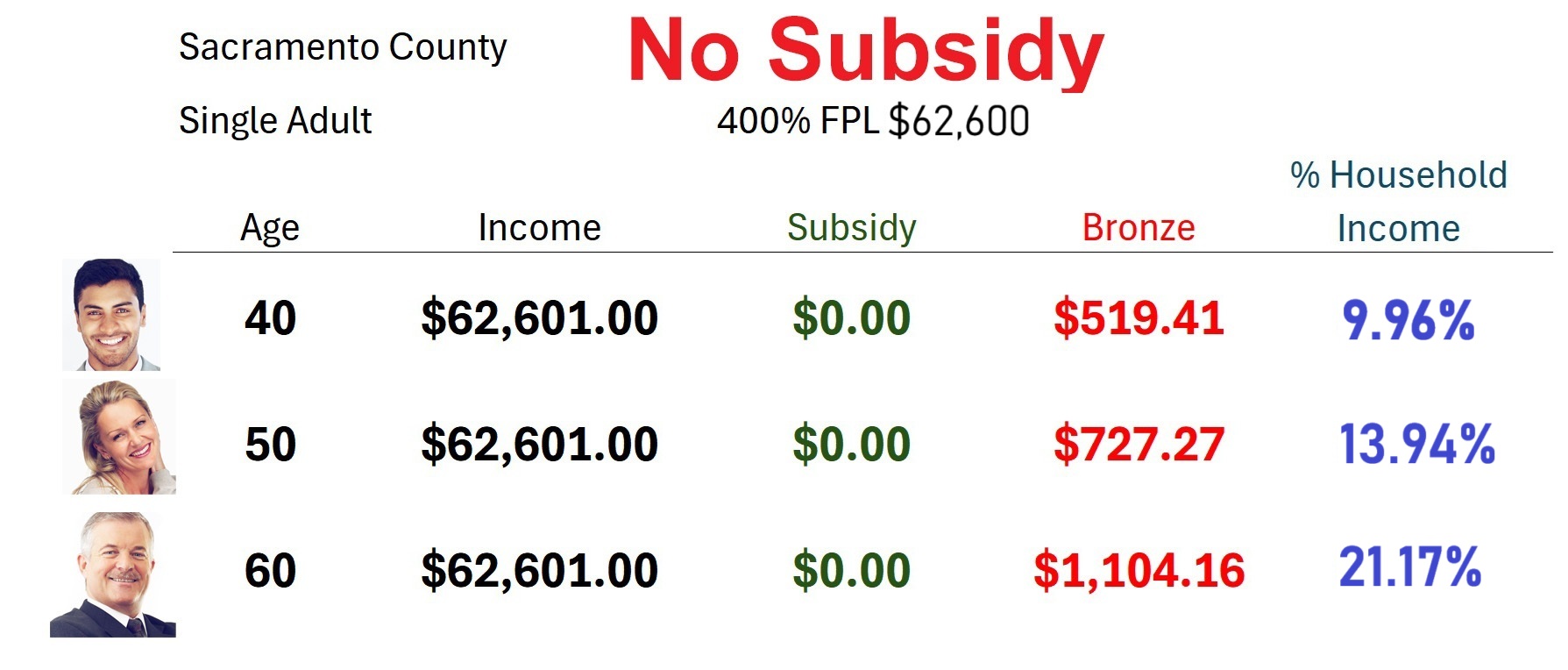 If these same individuals have an income $1 over $62,600, there is no subsidy. The lowest priced Bronze plan in Sacramento County for a 60-year-old equates to over 20 percent of their household income. The monthly health insurance premium jumps from $270 to $1,104 just because of a $2 increase in the household income.