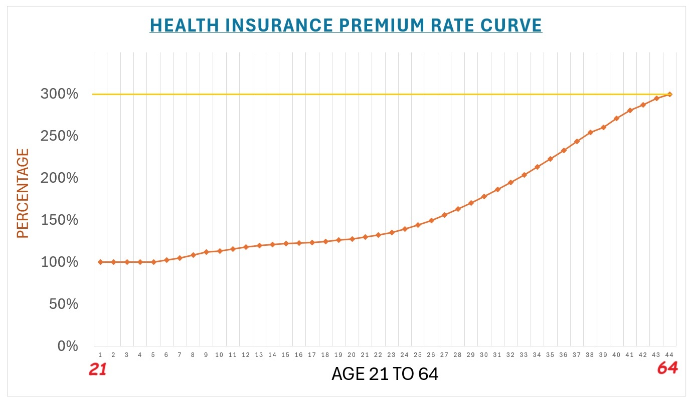 The monthly rates for a 64-year-old individual can be no more than 300 percent of the 21-year-old individual. The health insurance rates are not a straight line between ages 21 and 64. The rate increases are weighted more heavily on individuals over 50 because older people use more health care services. While the higher rates help older Americans reduce their health insurance premiums if they receive a subsidy, they have exorbitantly high premiums without a subsidy.