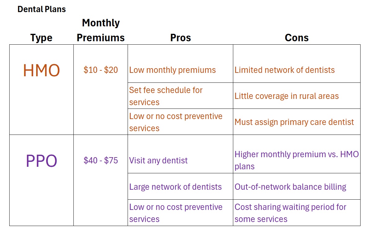 Unlike health insurance, there is no standard benefit design when it comes to dental plans. Even though the majority of dental plans have coverage and benefit designs that are similar within the PPO and HMO categories, it’s important to read the fine print for deductibles, exclusions, waiting periods, and reimbursement schedules. A starkly lower premium rate between two plans with similar coverage and benefits indicates that the lower priced plan may have some restrictions or exclusions within the plan.