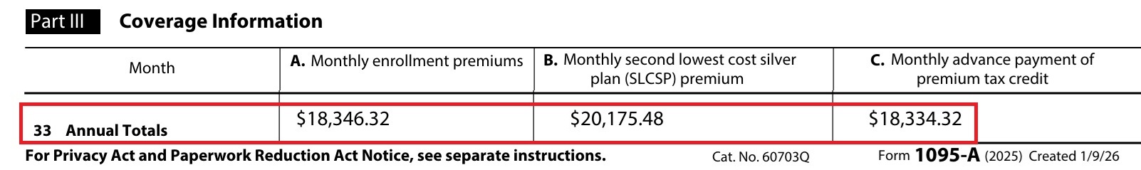 Mary Lynn had estimated her income at $38,947.32 for 2025 and received a subsidy based on that amount to lower the health insurance premium. However, Mary Lynn’s final Modified Adjusted Gross Income for 2025 came to $45,000.