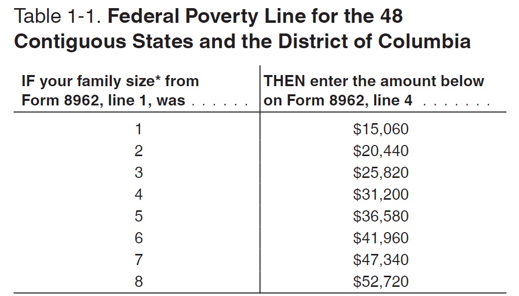 The $45,000 income divided by $15,060 yields a percentage of 299 (line 5). Then you go to the 8962 instructions to find the applicable figure.