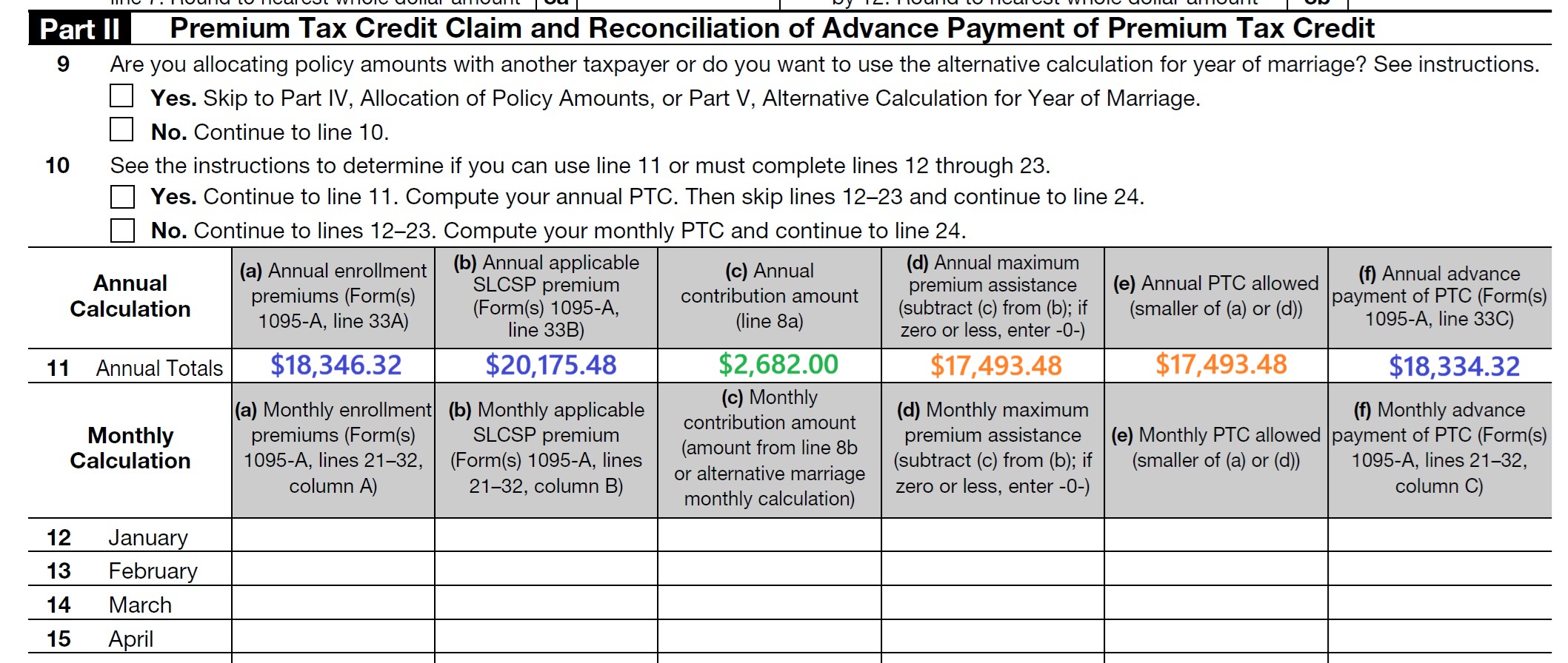 Information from the 1095-A is transferred to Part II of 8962 on line 11 columns a, b, and f. If you receive multiple 1095-As you would enter the dollar amounts by month on form 8962. The consumer fair share from line 8a of Part 1 is entered on line 11c. On line 11d, the consumer fair share of $2,682 is subtracted from line 11b the second lowest cost silver plan, which is the benchmark plan for calculating the subsidies.
