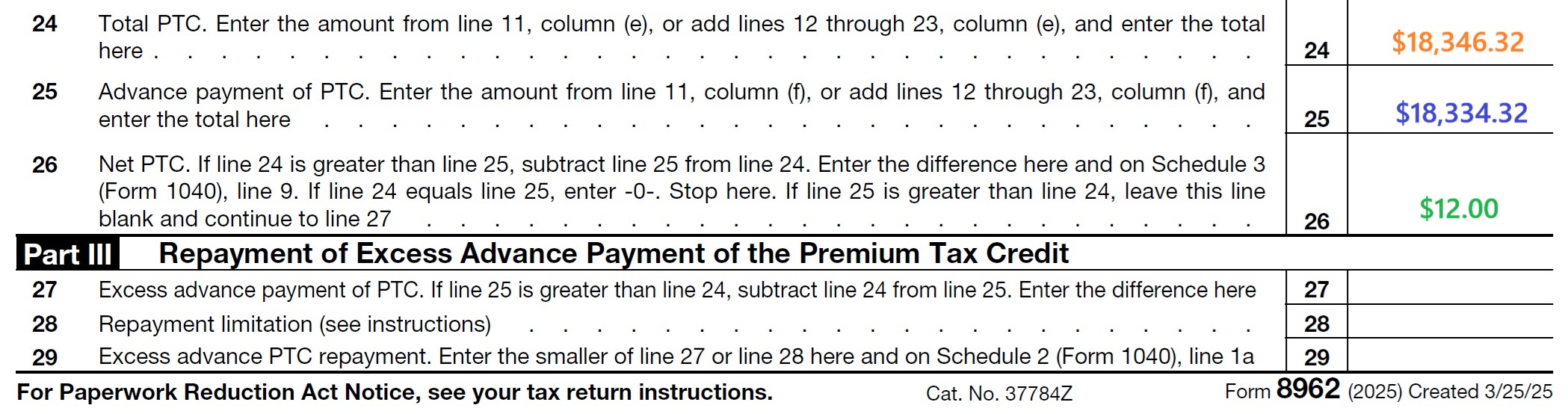 Line 11f, total health insurance subsidies paid on behalf to Mary Lynn during 2025, is transferred to line 25. Covered California paid $18,334.32 in subsidies, but Mary Lynn, because her income was higher than estimated, is only eligible for a maximum allowable Premium Tax Credit subsidy of $17,493.48. The difference is $804.84. Mary Lynn received $804.84 too much in health insurance subsidies. She must pay this dollar amount back to the federal government (line 27 of Part III).