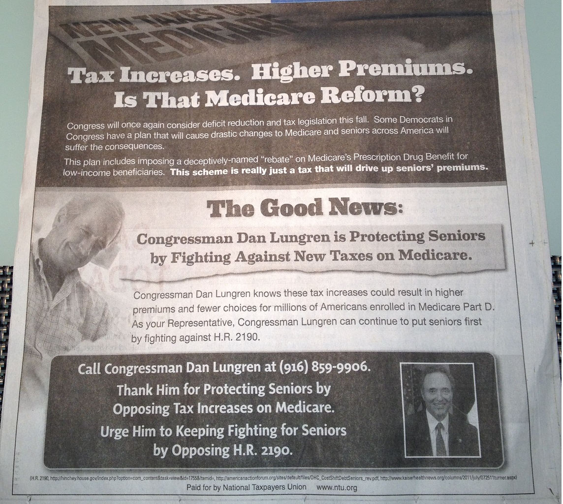 As I opened my Sacramento Bee Sunday paper (8/26/12) I was struck with a familiar looking advertisement. It was another “pro” Lungren ad. But instead of being sponsored by the American Action Network, this ad was purportedly placed by the National Taxpayers Union. The ad, which look suspiciously liked a “pro” Lungren ad placed by the American Action Network a couple months back, was thanking Rep. Lungren for his fight against H.R. 2190. The ad erroneously leads the reader to believe that Democrats have proposed a tax on the Part D Prescription Drug benefit. Let’s dissect the advertisement: