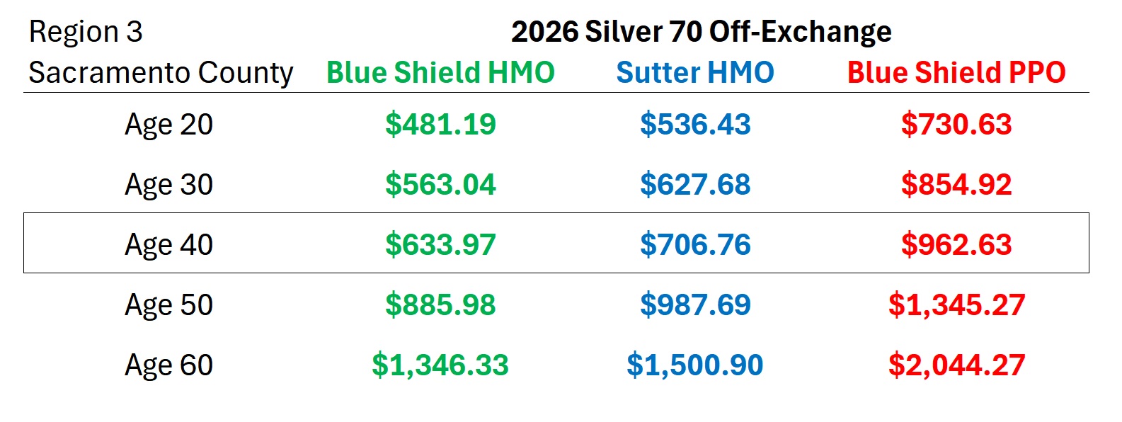 I was surprised, and I had to check the rate sheets twice, that the Sutter Silver 70 is more expensive than both the Blue Shield HMO and PPO plans in Santa Clara County. For a 40-year-old, the Sutter Silver plan is $110 more per month than the Blue Shield PPO.