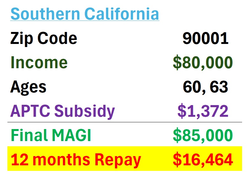 The repayment is worse if you live in Northern California. This couple, ages 60 and 63, estimated the same $80,000 on their Covered California application. They receive $3,040 a month in a health insurance subsidy. Their final MAGI, like the Southern California couple, is $85,000 triggering a repayment of $36,480 to the IRS.
