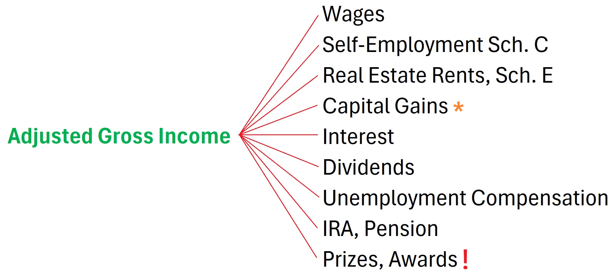 The adjusted gross income, line 11 of the first page of the 1040, is an aggregation of various forms of income from different schedules. Some of the income includes wages, self-employment, rents, capital gains, interest, dividends, unemployment compensation, IRA, pensions, prizes and award.